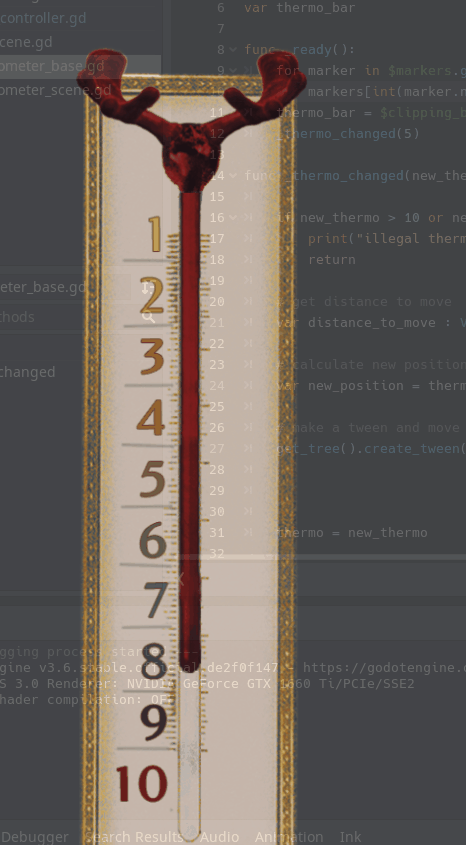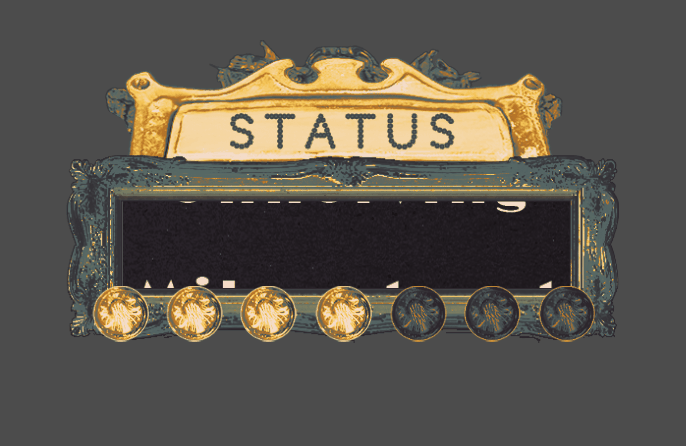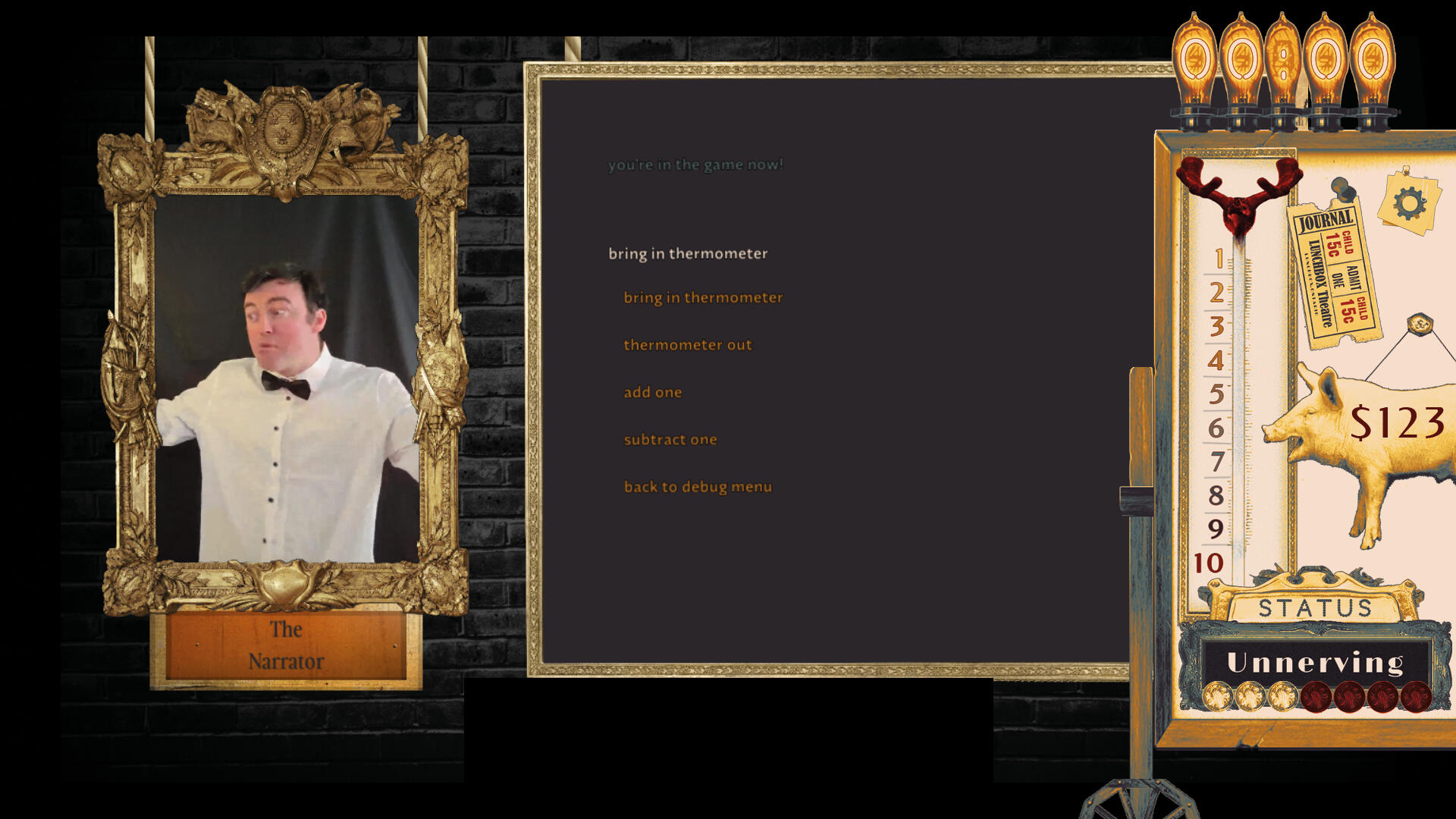 Brief: Side menu that slides in and out, set in a derilict had-been comedy club, with a collage feel to it. Includes a nixie clock, thermometer countdown, displays for status and money, and buttons for a journal and settings.I leant into the amateur theatre aspects with font choices, and married all the eclectic elements together with a consistent colour palette, inspired by old cigarette packaging.The thermometer is made to look like a moose, like the game's antagonist.